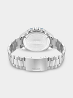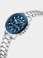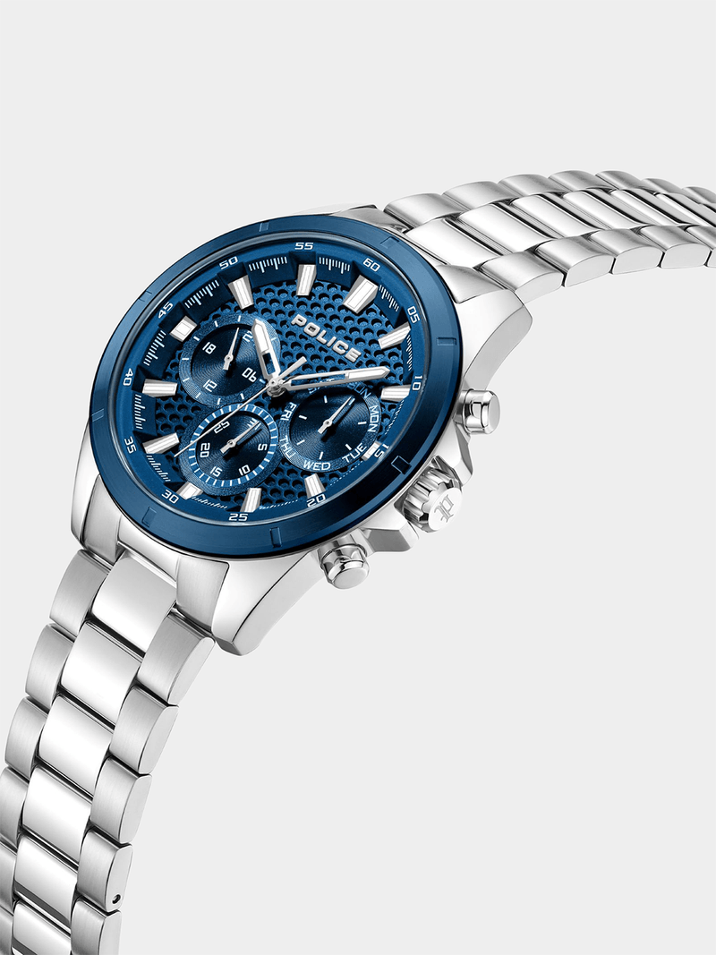 Motion, designed to turn heads with its striking blend of style and performance. Encased in a 45mm stainless steel case with a polished and brushed finish, this timepiece features a bold navy blue dial, enhanced by a unique honeycomb texture and applied indexes. The IP blue topring adds a refined contrast, making it a standout accessory. Powered by a multifunction movement, this bracelet watch offers sub-dials for day, date, and 24-hour functions, providing both utility and elegance.