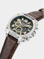 This stylish watch features a Stainless Steel round case, black dial with chronographic movement and brown genuine leather strap.