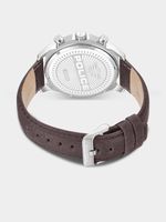 This stylish watch features a Stainless Steel round case, black multifunction dial with chronographic movement and dark brown genuine leather strap.