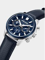This stylish watch features a Stainless Steel round case with a Blue Plated top ring, matte blue multifunction dial and dark blue genuine leather strap.