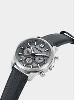This stylish watch features a Stainless Steel round case, cool grey multifunction dial and grey genuine leather strap.