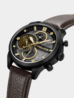 This stylish watch feature a Gunmetal Plated round case, black and gilt-toned multifunction dial and dark grown genuine leather strap.
