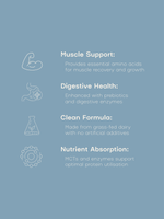 Clean, grass-fed whey protein with 20g protein per serve, digestive enzymes, and prebiotics. Naturally flavoured vanilla. No artificial additives - just smooth, gut-friendly fuel.