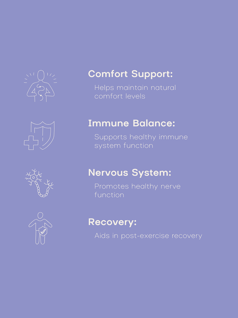 Naturally occurring PEA supports comfort, recovery, and immune balance by modulating the endocannabinoid system - without any psychoactive effects.