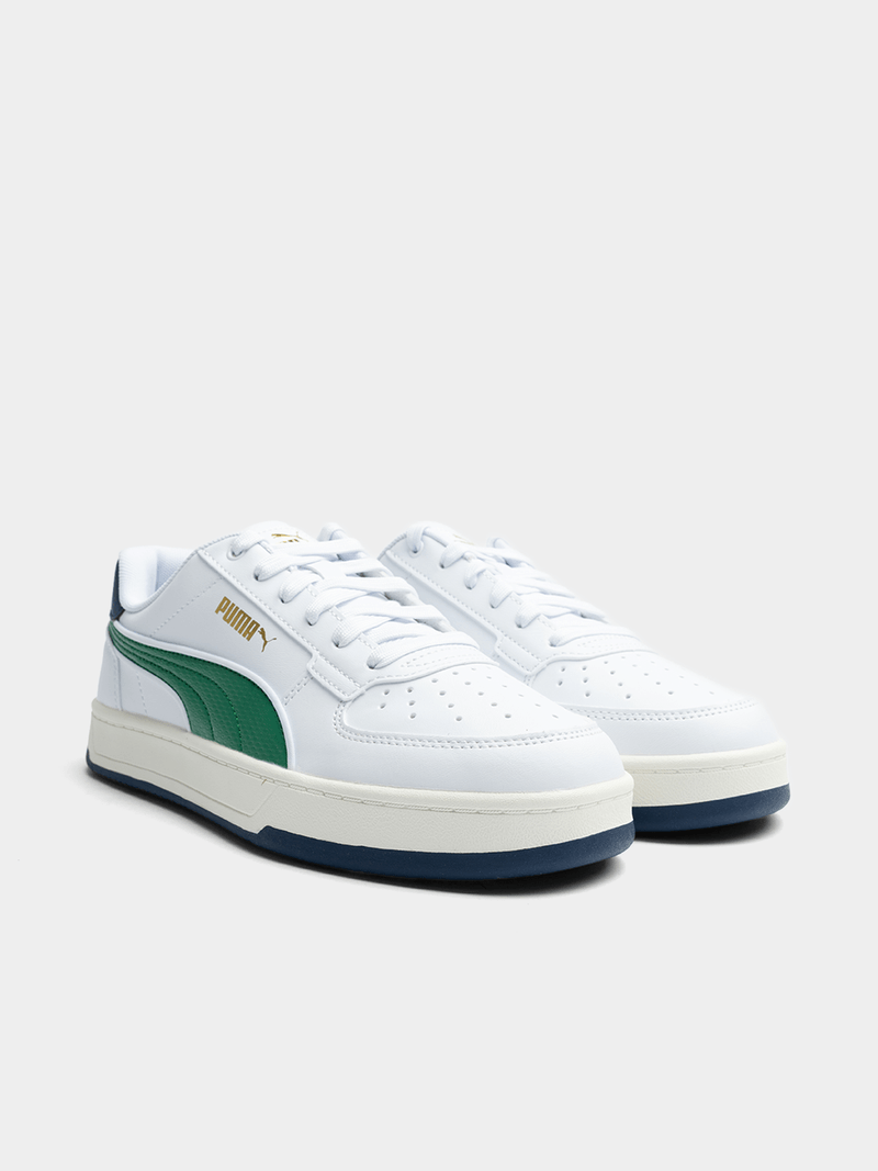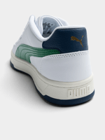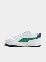 The White and Green Puma Caven 2.0 Retro Youth Shoes combine a 1990s collegiate aesthetic with contemporary comfort features.