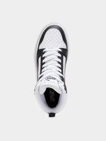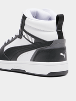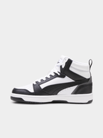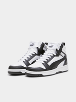 The Junior Puma Rebound V6 Mid in Black/White is a high-performance, court-inspired sneaker that brings classic basketball DNA to a new generation. Featuring a timeless "tuxedo" colorway, this mid-top silhouette combines a durable synthetic leather upper in deep black with a crisp white Puma Formstrip and branding. The mid-cut collar is padded to provide extra ankle support and a secure fit, while the signature SoftFoam+ sockliner offers superior, all-day cushioning. Finished with a robust rubber cupsole, these sneakers are built to handle the intensity of the playground while maintaining a sharp, urban aesthetic.