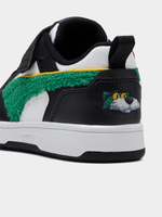The Kids’ Puma Rebound V6 Lo Super Puma AC+ in Black, White, and Green is a vibrant, character-filled update to the classic court-inspired silhouette. This special "Super Puma" edition features a durable synthetic leather upper in a sleek black and white base, electrified by bold "Electric Green" accents and playful branding inspired by Puma’s iconic retro mascot. Designed with the AC+ (Alternative Closure) system, it utilizes elastic laces and a secure hook-and-loop strap to ensure a snug fit that kids can manage independently. With the signature SoftFoam+ sockliner providing a cloud-like feel, these sneakers are built to handle high-energy play with a unique, heroic flair.