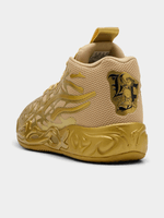 Across the mesh and TPU-laden upper, this MB.04 comes coated in golden hues: light gold on its mesh base and matte gold on its 3D alien tentacle-inspired overlays. These overlays wrap across the toebox back to the midfoot, forming branding details for LaMelo, like his “1 Of One” and “Rare” monikers. Accenting hues of black are found on the vamp, the spine of the tongue, and the phoenix logo atop the tongue’s golden leather overlay.Other gold details include the Puma Formstrip on the midfoot and the custom graphic on the heel tab. Here, we see LaMelo depicted as a cherub between his LaFrance brand’s logo. Below, the Nitro Foam-infused midsole has a golden finish on the foam and TPU portions and a matching hue on the rubber outsole.(Supplier Style:311306 01)