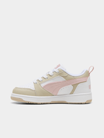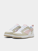 The Junior Puma Rebound V6 Lo in Beige/Pink is a soft, trend-forward take on the classic basketball-inspired silhouette. Trading the traditional high-contrast "court" colors for a more contemporary, lifestyle palette, this model features a durable synthetic leather upper in a versatile "Sand" or Beige base. The look is beautifully elevated by "Marshmallow" or soft pink accents on the Formstrip and branding, offering a feminine, sophisticated edge to a sporty design. With its low-profile cut and signature SoftFoam+ sockliner, this sneaker provides maximum ankle mobility and plush cushioning, making it a perfect daily driver for style-conscious juniors.