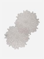 Bring a luxe feel to the table with our PVC Indira Round Silver Leaf Placemats. The round leaf-inspired design brings an organic yet glamorous feel to your setting. Made from durable and wipable PVC, they make post-meal clean-ups a breeze.