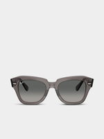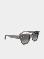 Ray-Ban State Street sunglasses are a unique square shape in transparent grey acetate frames. The grey gradient lenses gives them a timeless look that makes these shades perfect for any occasion. These sunglasses are designed with you in mind, so get ready to make a statement with your style.