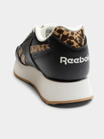 Step up your sneaker style with these women’s Reebok trainers in black and white, featuring bold leopard print accents. Crafted with a layered mix of leather and synthetic leather, they’re designed for both style and durability. The stacked midsole adds extra height, while the signature ripple outsole delivers a rugged, standout look.
