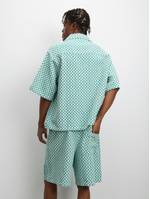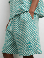Introducing Redbat Athletics green knitwear shorts. Made from a blend of cotton and polyester for comfort. Features a relaxed fit silhouette. Perfect for those looking for a casual and stylish addition to their wardrobe.
