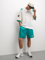 The Redbat Athletics Women’s Teal Mesh Shorts are made from 100% polyester in a breathable mesh design. An elasticated waistband with adjustable drawstring offers comfort, while a Redbat logo print completes the style. Redbat is exclusive to Sportscene.