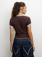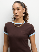The Redbat Classics Women's Choc/Blue Rib Fitted Tee is made from stretch cotton in a fitted crew neck style with short sleeves. A tonal embroidered logo and contrast edging complete the style. Redbat is exclusive to Sportscene.