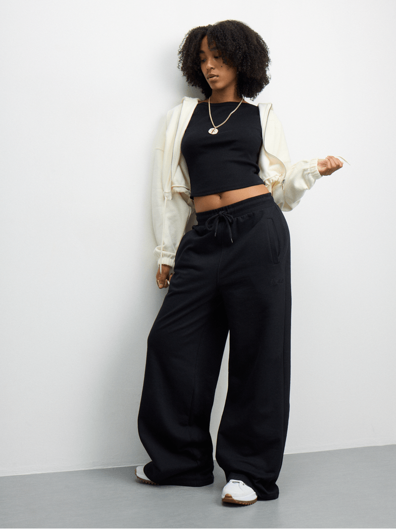 Step up your loungewear game with these Redbat Classics wide leg sweatpants in sleek black. Made from a cozy fleece material with a touch of cotton, these oversized sweatpants feature a convenient pocket for all your essentials. Perfect for all-day comfort and style.