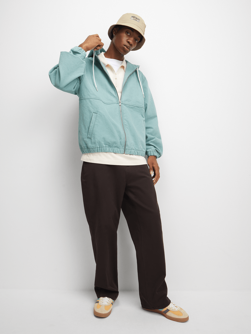 Stay cool and stylish with this aqua canvas jacket. Crafted with high-quality canvas and cotton, this unlined jacket is perfect for any occasion. Designed for comfort and durability, it is easily returnable. Perfect for adding a pop of color to your outfit.
