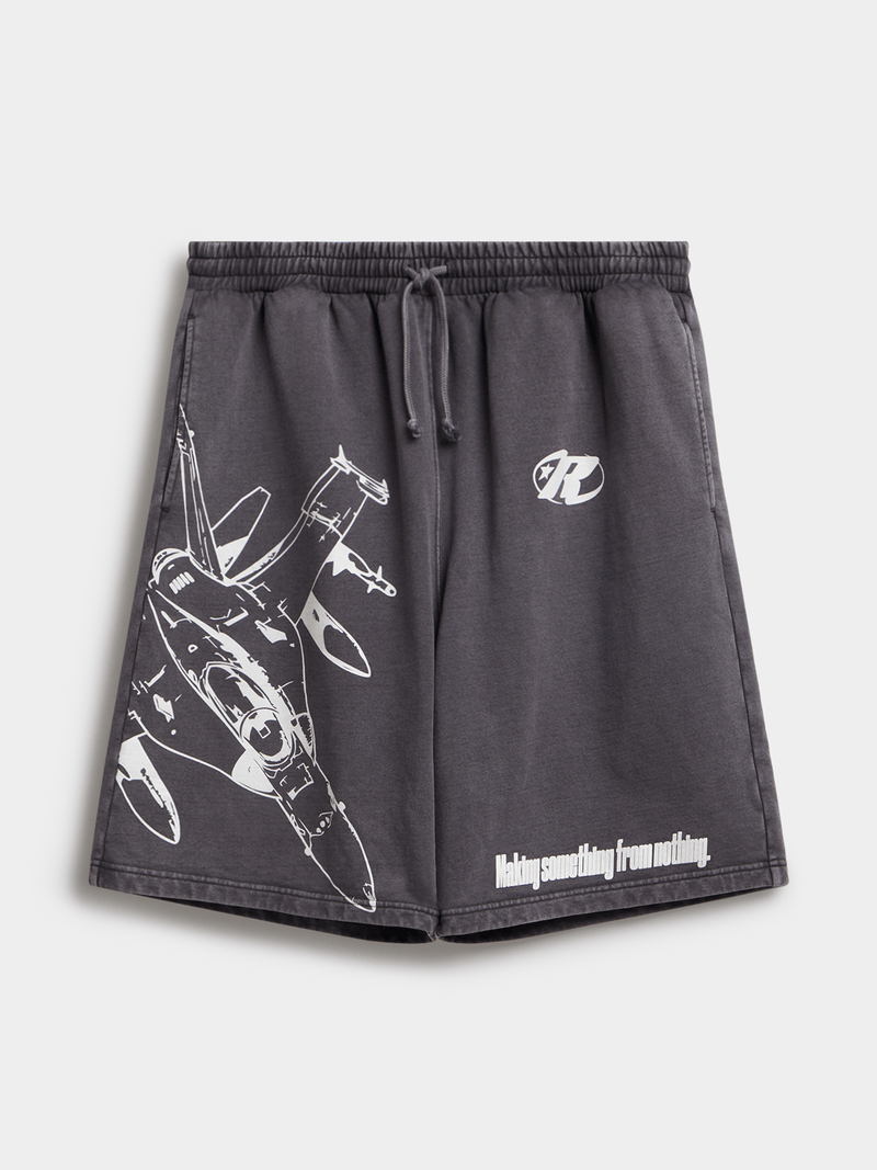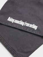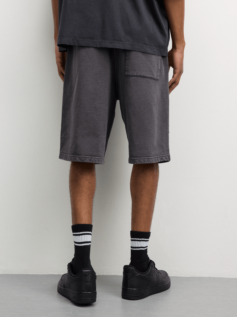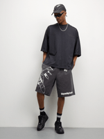 Introducing Redbat men's laundered graphic jort in charcoal. Made from cotton fabric, these shorts offer an oversized fit for ultimate comfort. Perfect for everyday wear, these shorts are a versatile addition to your wardrobe. Enjoy the relaxed style and quality construction.