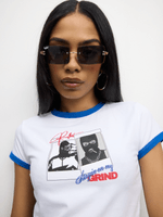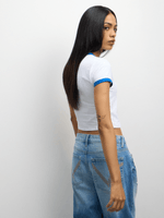 Get your hands on the Redbat baby tee with contrast binding in white and cobalt. Made from a soft cotton blend fabric, this trendy t-shirt is perfect for everyday wear. With a comfortable fit and stylish design, you'll be turning heads wherever you go. Match it with your favorite bottoms for a cool and casual look.
