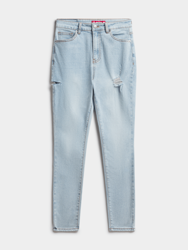 Elevate your denim game with these Redbat high-rise skinny jeans. Made from denim, they feature a flattering super skinny leg shape. Feel confident and stylish with minimal rips on a light wash. Enjoy the comfort and flexibility of these returnable jeans. Perfect for any casual occasion.