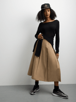The Redbat pleated tan skirt is a versatile addition to any wardrobe. Made of soft cotton, this midi skirt is perfect for any occasion. The pleats add a touch of elegance, while the tan color is easy to pair with any top. Stand out in style with this must-have piece.