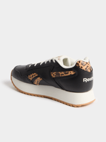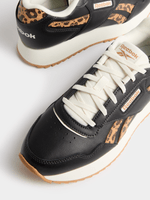 Step up your sneaker style with these women’s Reebok trainers in black and white, featuring bold leopard print accents. Crafted with a layered mix of leather and synthetic leather, they’re designed for both style and durability. The stacked midsole adds extra height, while the signature ripple outsole delivers a rugged, standout look.