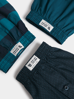 The Relay Jeans Men's Classic Check Boxers Trio is a set of three stylish, regular-fit cotton boxers. Each boxer flaunts a distinct, monochrome checkered pattern, adding a timeless touch to your underwear collection. Made from 100% cotton, they ensure breathability and all-day comfort.