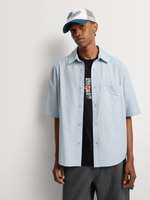 Own effortless everyday style with the Relay Jeans Men’s Boxy Fit Blue Stripe Shirt. The boxy silhouette delivers a relaxed, contemporary drape, while the pure cotton construction keeps the feel breathable and easy all day. Finished with clean vertical stripes and a crisp collar, it brings a refined yet laid-back energy to your warm-weather rotation. Short sleeves and a chest pocket add to its minimalist, modern appeal — perfect for off-duty days, weekend plans, or elevated casual looks.