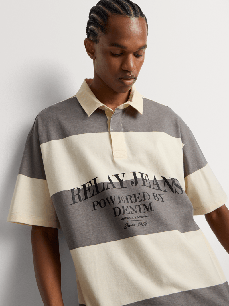 Own effortless everyday edge with the Relay Jeans Men’s Boxy Fit Rugby Grey Stripe Golfer. Designed for comfort that lasts and style that lands, this golfer pairs a relaxed boxy silhouette with soft single jersey cotton for all-day ease. The grey stripe design brings a clean, modern rhythm, while the bold front print taps into that signature Relay street identity. Warm-wash care keeps it simple, so you can wear it on repeat — from campus days to chilled link-ups and weekend missions.