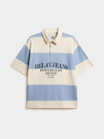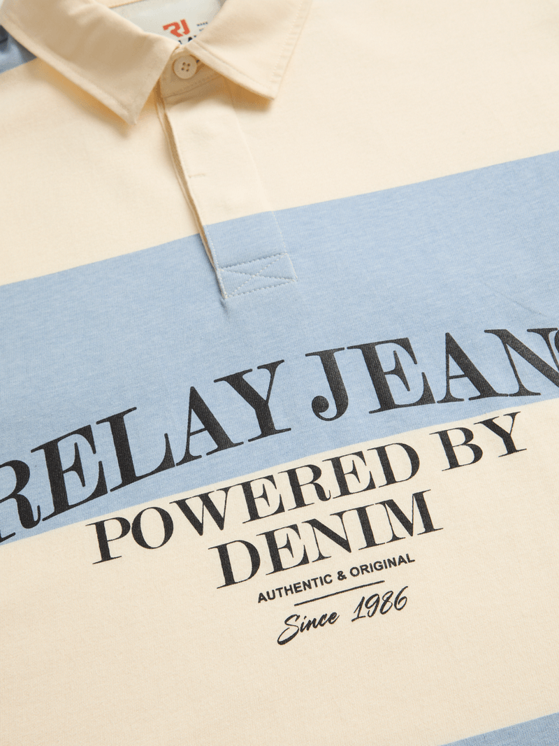 Soft stripes. This Rugby Golfer pulls up with that oversized, easy-flow swagger — the kind of fit that feels like you’re moving in your own rhythm. The single-jersey fabric stays light, smooth, and always ready for the streets. The bold Relay Jeans graphic hits across the chest, stamping your look with real denim-born attitude. Clean. Confident. Unfiltered. Style it with loose-fit denim and white kicks.