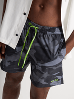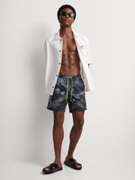 Elevate your swim style with these camo charcoal swim shorts. Made from nylon, featuring a regular fit for all-day comfort. Enjoy easy care with warm wash, cool iron, and dry cleanable instructions. Perfect for your next beach adventure.