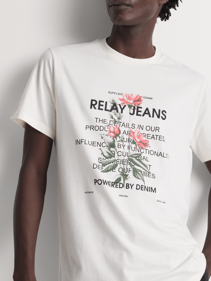 Stay stylish with the Floral Text Ecru T-Shirt from Relay Jeans. Made from comfortable cotton fabric, this regular fit tee features a crewneck style detail and is perfect for any casual occasion. Easy to care for with warm wash instructions. Ideal for those who appreciate quality and comfort.