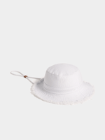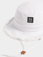 The Relay Jeans Men's White Denim Boonie Hat is a stylish accessory crafted from 100% cotton denim. Featuring a rugged white wash, this hat includes side air vents for breathability and a wide brim for sun protection. A contemporary twist on a classic, it blends functionality with street-style flair.