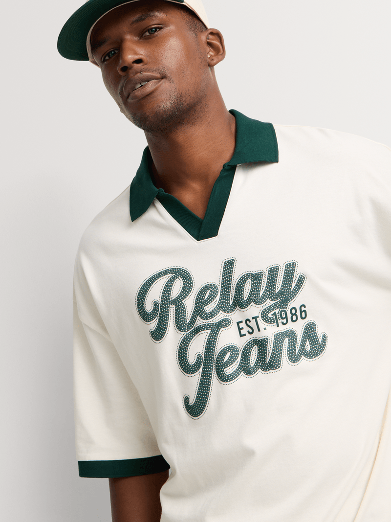 Update your wardrobe with the Relay Jeans Extreme Boxy Contrast Revere Milk Golfer. Made from soft single jersey fabric, this golfer features a stylish contrast design. Easy to care for with warm wash instructions. Stay trendy with this cool and casual top.