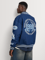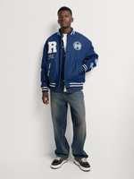 The Relay Jeans Men’s Padded Denim Blue Varsity Jacket is made to stand out while staying rooted in everyday wear. Designed with a padded construction for added warmth, it features classic varsity details including ribbed collar, cuffs, and hem, a snap-button front, and statement embroidered and appliqué branding across the chest and sleeves. Cut for a comfortable fit in a rich denim blue tone, this jacket balances heritage varsity style with modern street confidence—made for layering, movement, and effortless impact.