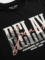 Elevate your street style with the Relay Jeans graphic t-shirt in black. Crafted from soft single jersey fabric, it offers a regular fit for all-day comfort. Your go-to when you want the room to feel you before you speak. Keep it classic with blue jeans and crisp kicks. Layer under a bomber when the night gets loud.