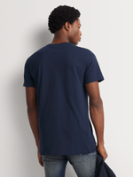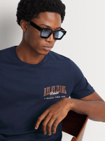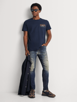 The Relay Jeans Men's Chest Distressed Navy Graphic T-Shirt adds a rugged touch to your wardrobe with its vintage, worn-in look. Featuring bold graphic prints across the chest, the 100% cotton fabric ensures breathability and comfort. Perfect for casual outings, its regular fit complements any laid-back style.
