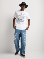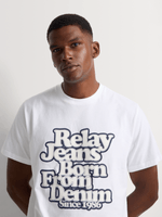 Introducing the Relay Jeans white T-shirt with stitched bubble text. Made from comfortable single jersey fabric, this tee features a crewneck style detail. Easy care instructions: warm wash, cool iron, or dry cleanable. Enjoy the regular fit and timeless design. Perfect for casual everyday wear.