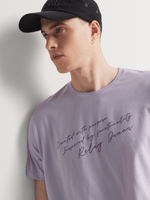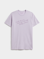 Meet the Relay Jeans Regular Slanted Script Lilac T-Shirt. Made from comfortable cotton fabric with a crewneck style detail. Easy to care for with warm wash instructions. Enjoy the regular fit for a relaxed look. Perfect for everyday wear.