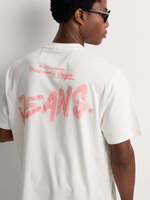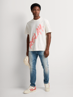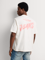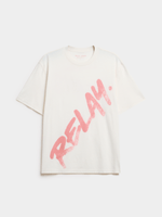The Relay Jeans relaxed t-shirt features a multi-panel spray paint design in ecru. Made from soft cotton jersey. Easy to care for with warm wash and cool iron instructions. Perfect for a laid-back crewneck style. Crafted in South Africa for quality and comfort. Ideal for anyone looking for a comfortable and stylish graphic tee.