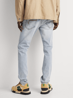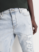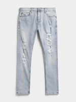 Push your style forward with denim that makes a statement. These light blue skinny jeans feature a mid-rise waist and a sleek, tight fit from top to bottom, creating a clean, modern silhouette. Thoughtful rip and repair detailing adds a rugged edge, while premium stretch fabric ensures all-day comfort and easy movement. Pair them with a graphic tee or a crisp shirt for effortless street-inspired style.