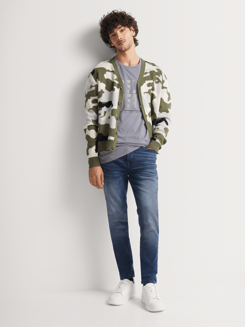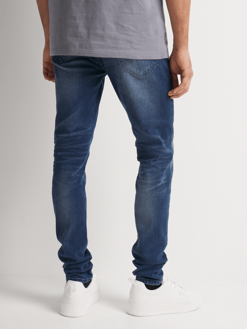 Relay Jeans Men's Super Skinny Med Wash Blue Denim, an essential addition for the modern man. Crafted with a medium wash finish and subtle distressing, these jeans offer a sleek, super skinny fit. Made from cotton and elastane, they ensure comfort and style, reflecting a sustainable choice.