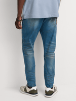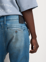 This tapered blue jean features a longer, relaxed rise for comfort through the waist and seat, with a straight fit through the thigh that narrows cleanly toward the hem. Made from premium stretch fabric, it moves with you while keeping its shape — delivering all-day comfort without losing definition. Layered ease: Works with a lightweight jacket or overshirt.