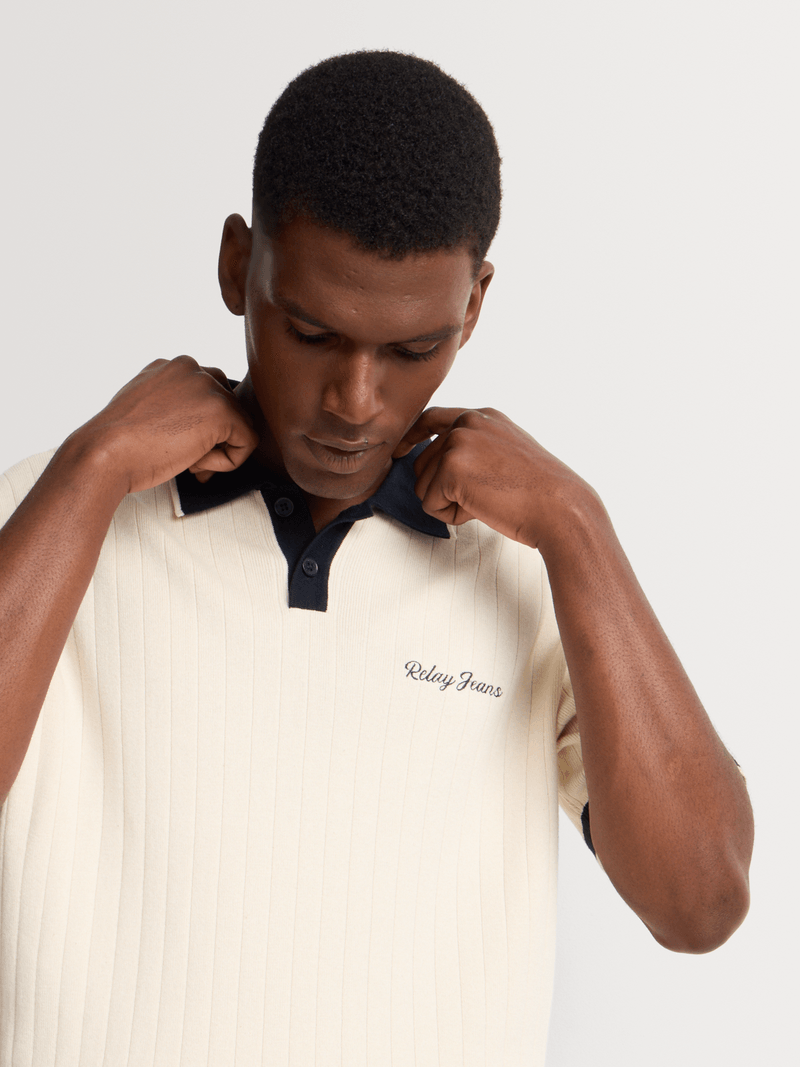 Stay cozy and stylish in this Tipped Ecru Knitwear Golfer from Relay Jeans. Made with a soft blend of acrylic and cotton, this golfer features a warm wash, cool iron, and is dry cleanable. The oversized fit adds a relaxed vibe to your look. Perfect for everyday wear.