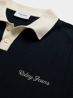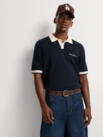 Stay cozy and stylish in our Tipped Navy Knitwear Golfer. Made with a blend of acrylic and cotton, this golfer features warm wash instructions, cool ironing, and is dry cleanable. With an oversized fit, it's perfect for anyone looking for a relaxed and comfortable style.
