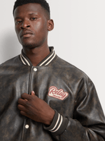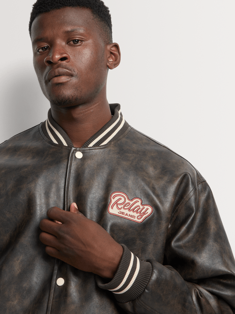 Bold with a throwback edge, the Relay Jeans Men’s Vintage Brown Bomber Jacket is made from PU fabric, giving it a smooth, leather-look finish with a modern feel. Designed in an oversized fit, it delivers relaxed confidence and easy layering, while the washed brown tone adds a vintage, worn-in character. Finished with classic bomber details like ribbed trims, a snap-button front, and statement branding, this jacket brings strong street presence with everyday comfort—confident, effortless, and unmistakably Relay.