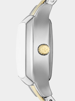 The Relic by Fossil Everly three hand watch for women is the perfect mix of classic style and function. This petite watch has a durable ionic plated two-tone stainless steel case with a sturdy mineral glass lens. The silver dial features gold luminous hands to check the time in low light. The two-tone link bracelet has self-adjustable buckles. Everly is water-resistant and can withstand hand washing and swimming.