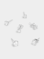 Expertly crafted in Rhodium Plated Brass Base Metal, this elegant set includes three pairs of round-cut Cubic Zirconia stud earrings in various sizes. Our earrings feature hypo-allergenic posts and stoppers for sensitive skin.