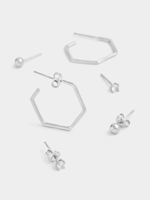 Expertly crafted in Rhodium Plated Brass Base Metal, this stylish set includes octagonal hoop earrings, ball stud earrings and dainty round-cut Cubic Zirconia stud earrings. Our earrings feature hypo-allergenic posts and stoppers for sensitive skin.