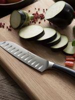 The Robert Welch 17cm Deep Santoku Knife has a wide scalloped blade for precision slicing and dicing, with a deep blade ideal for scooping the chopped food straight to the pan. Fully forged from high-quality German stainless steel with a hand-applied Japanese-style 15° edge for superior sharpness, and an ergonomic handle, the range is designed in consultation with professional chefs. The scallops on the Santoku blade create a pocket of air between the blade and the food, reducing friction and helping to prevent the food from sticking to the blade, allowing you to cut food more finely and precisely. Suitable for meat, fish, fruits and vegetables.